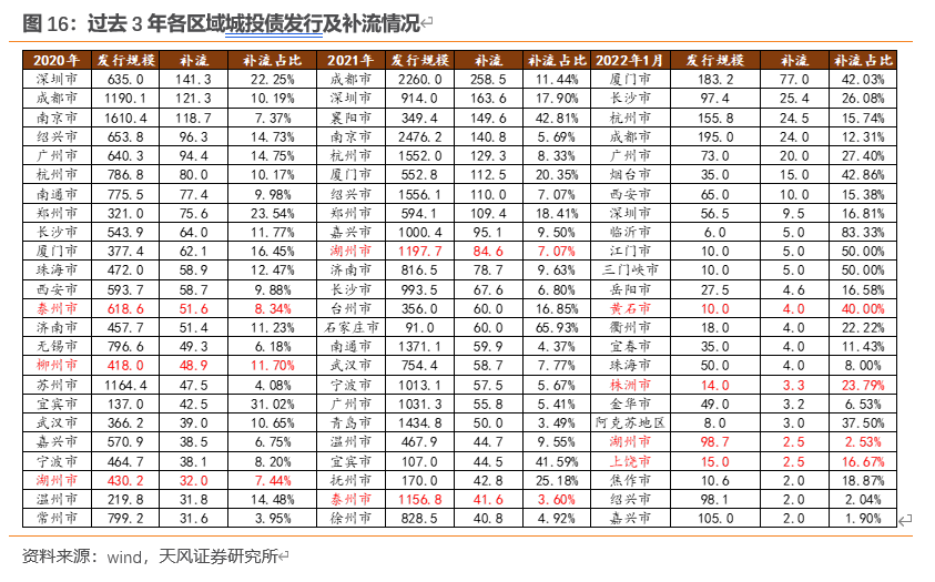 可以看到,近两年来城投平台发债用于补流规模较大的区域多是经济财政实力较强的地级市,这类区域或在分档划分时受约束相对较少(至少区域主要主体),而像泰州、柳州、湖州等地级市此前发债补流的规模不小,在监管政策调整的当下值得关注。