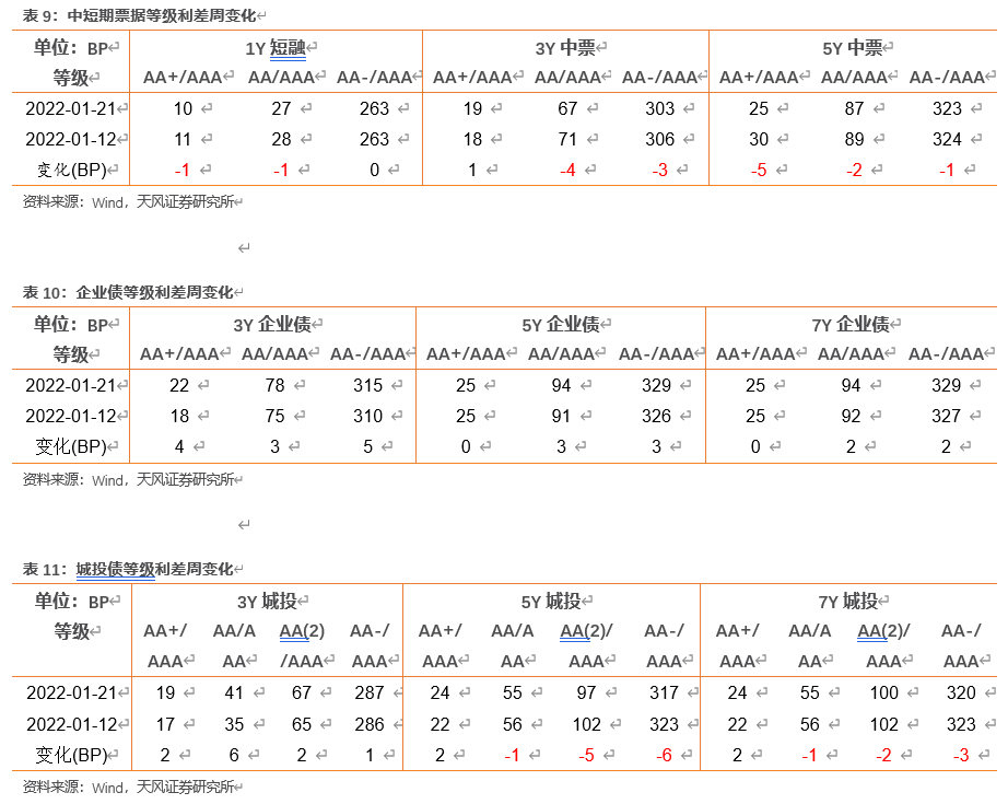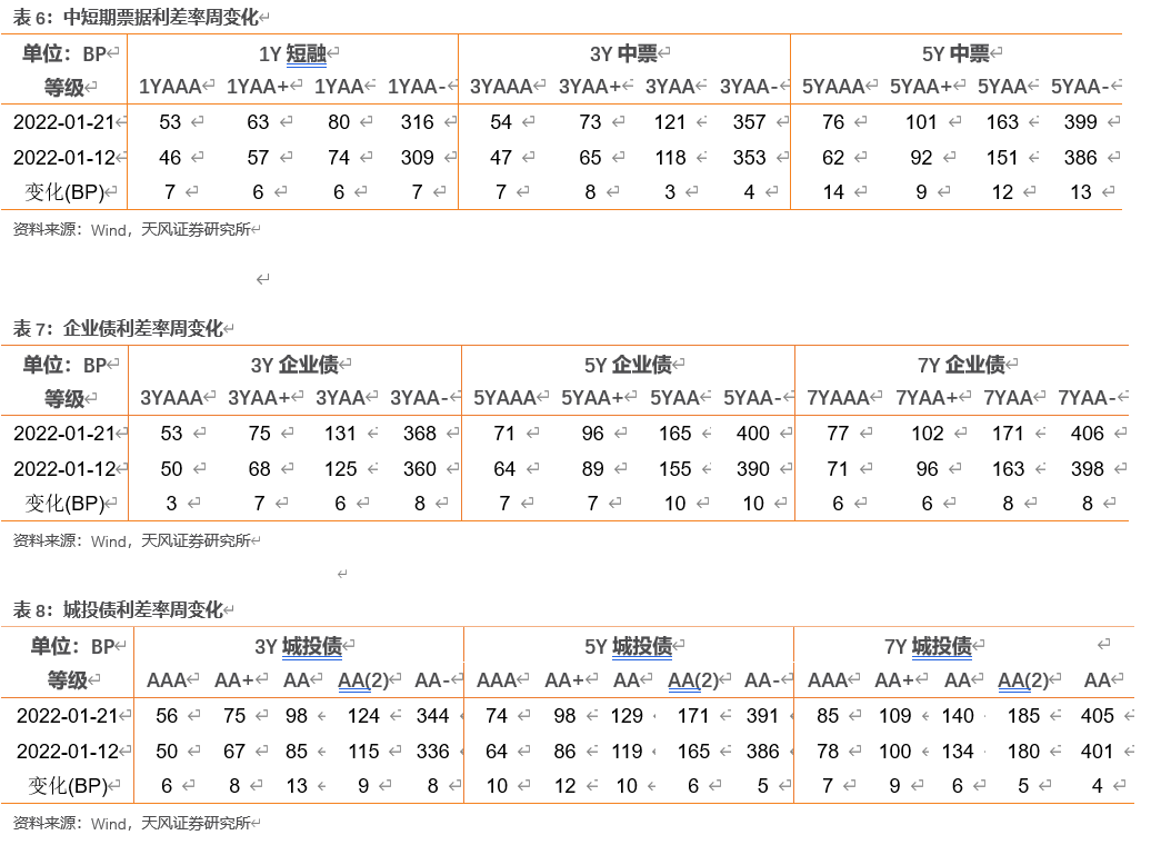 信用利差整体扩大。具体来看,中短期票据收益率曲线1年期各等级信用利差扩大6-7BP,3年期各等级信用利差扩大3-8BP,5年期各等级信用利差扩大9-14BP;企业债收益率曲线3年期各等级信用利差扩大3-8BP,5年期各等级信用利差扩大7-10BP,7年期各等级信用利差扩大6-8BP;城投债收益率曲线3年期各等级信用利差扩大6-13BP,5年期各等级信用利差扩大6-12BP,7年期各等级信用利差扩大4-9BP。