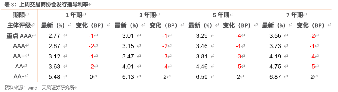 从发行利率来看,交易商协会公布的发行指导利率整体下行,各等级变动幅度-6-4BP。具体来看,1年期各等级变动-2-0BP;3年期各等级变动-4-2BP;5年期各等级变动-5-2BP;7年期各等级变动-5-6BP;10年期及以上各等级变化-6-4BP。
