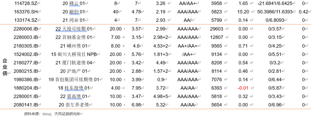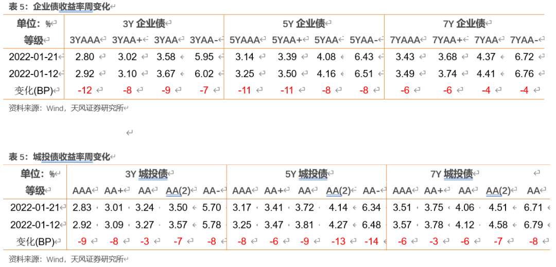 信用债收益率整体下行。具体来看,中短期票据收益率曲线1年期各等级收益率下行12-13BP,3年期各等级收益率下行8-13BP,5年期各等级收益率下行4-9BP;企业债收益率曲线3年期各等级收益率下行7-12BP,5年期各等级收益率下行8-11BP,7年期各等级收益率下行4-6BP;城投债收益率曲线3年期各等级收益率下行3-9BP,5年期各等级收益率下行6-13BP,7年期各等级收益率下行3-8BP。