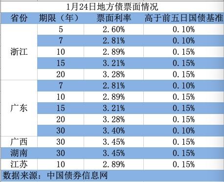 21世纪经济报道记者杨志锦 上海报道 1月24日,浙江、广东、广西、湖南、江苏五省份发行地方债1921亿。从中标利率看,广东、浙江部分期限地方债利差降至10BP。这印证了本报此前的报道(部分经济强省拟将地方债发行利差降至10BP)。