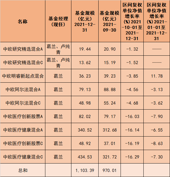 2021年四季度末,葛兰在管基金规模达1103.39亿元,较三季度末规模增长133.38亿元。其中,葛兰管理的四季度规模最大的基金为中欧医疗健康,基金规模达775.05亿元。