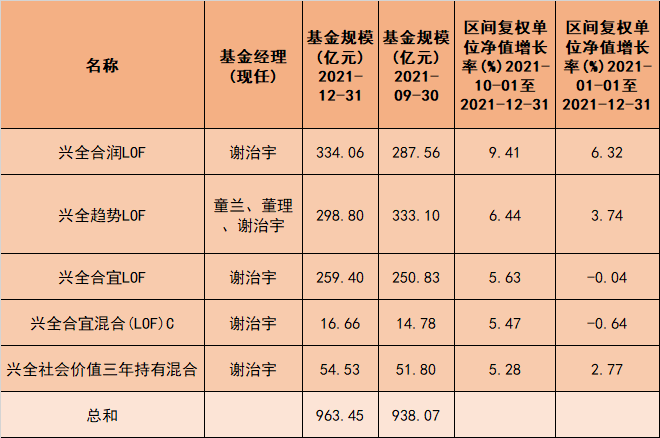 2021年四季度末,谢治宇管理4只基金(A/C份额合并计算)规模963.45亿元。其中,谢治宇管理规模最大的基金为兴全合润LOF,规模达到334.06亿元。
