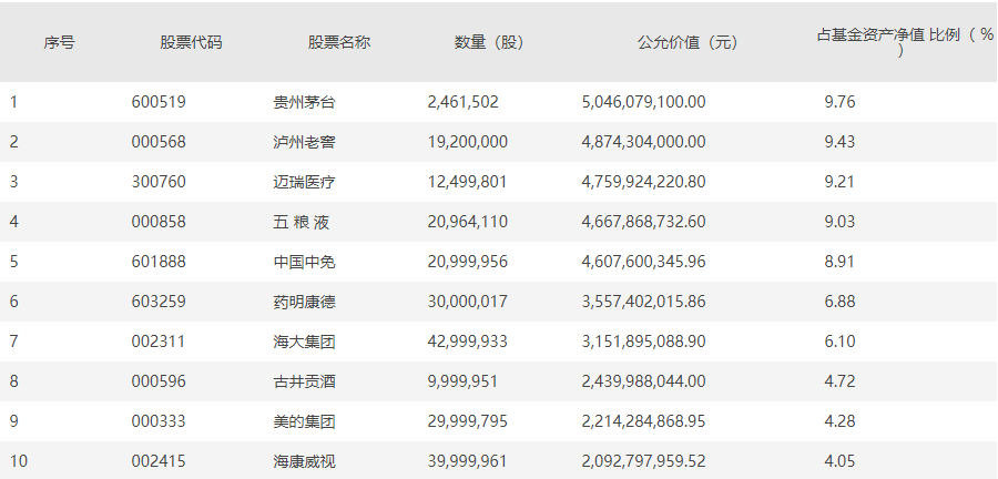 景顺长城新兴成长前十大重仓股分别为贵州茅台、泸州老窖、迈瑞医疗、五粮液、中国中免、药明康德、海大集团、古井贡酒、美的集团、海康威视。