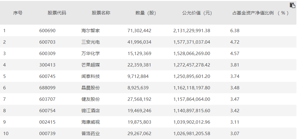 兴全合润保持高仓位运行,2021年四季度末股票仓位达92.78%。该基金前十大重仓股为海尔智家、三安光电、万华化学、芒果超媒、闻泰科技、晶晨股份、健友股份、锦江酒店、海康威视、普洛药业。