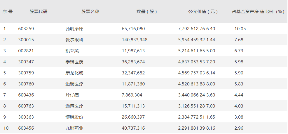 药明康德、爱尔眼科、凯莱英、泰格药业、康龙化成、迈瑞医疗、片仔癀、通策医疗、博腾股份、九洲药业进入中欧医疗健康前十大重仓股。