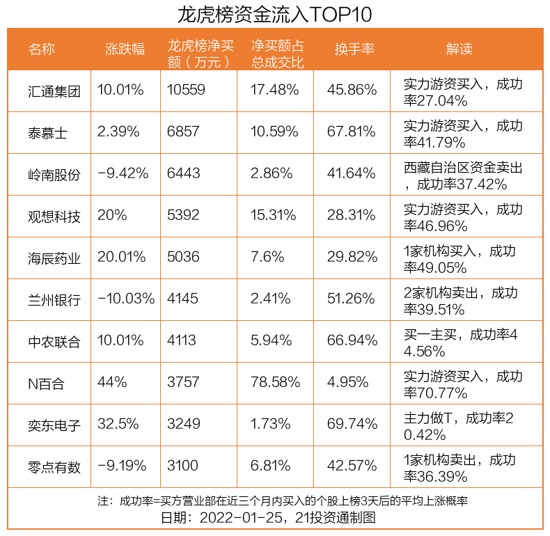 1月25日,上证指数下跌2.58%,深证成指下跌2.83%,创业板指下跌2.67%。盘后龙虎榜数据显示,共有41只个股因当日异动登上龙虎榜,资金净流入最多的是汇通集团(603176.SH),达1.06亿元。