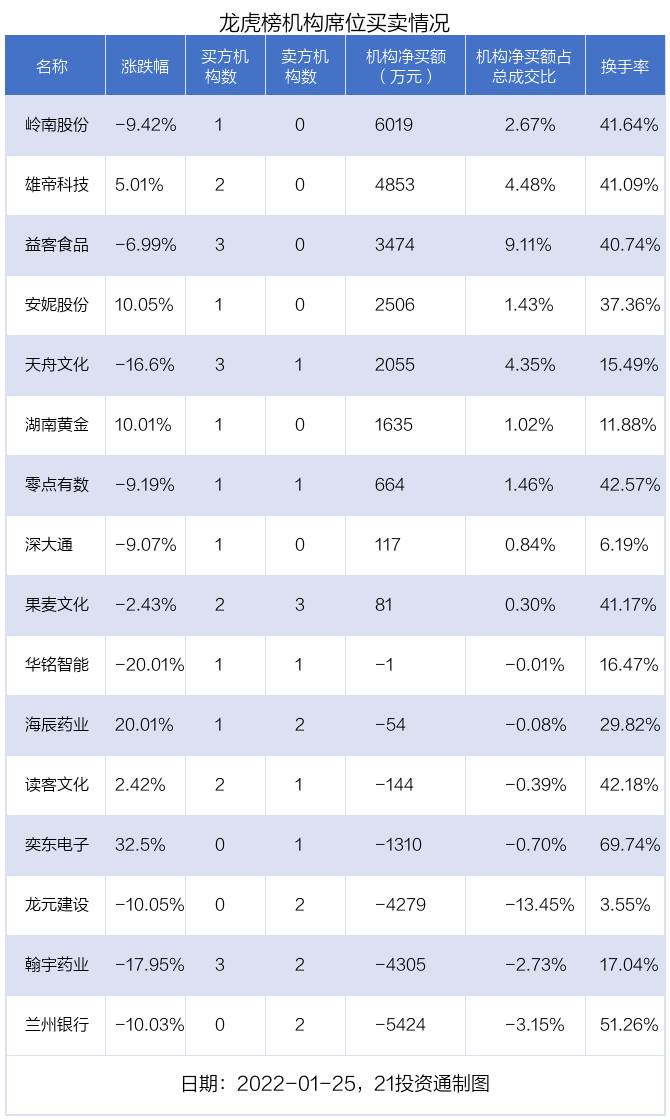 1月25日,16只个股龙虎榜出现了机构的身影,机构合计净买入5887.64万元。具体来看,机构净买入9股,净卖出7股。