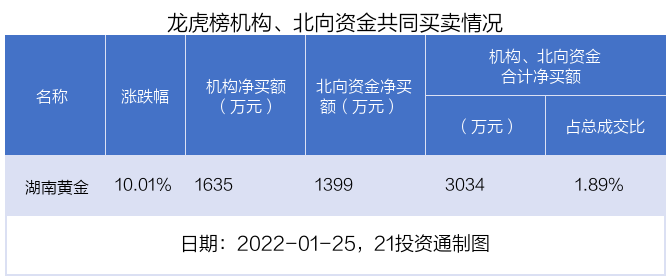 值得注意的是,机构和北向资金共同净买入了湖南黄金。1月25日,贵金属板块逆市走高,指数涨1.74%,湖南黄金、西部黄金涨停,金贵银业、山东黄金、中金黄金等涨超2%。