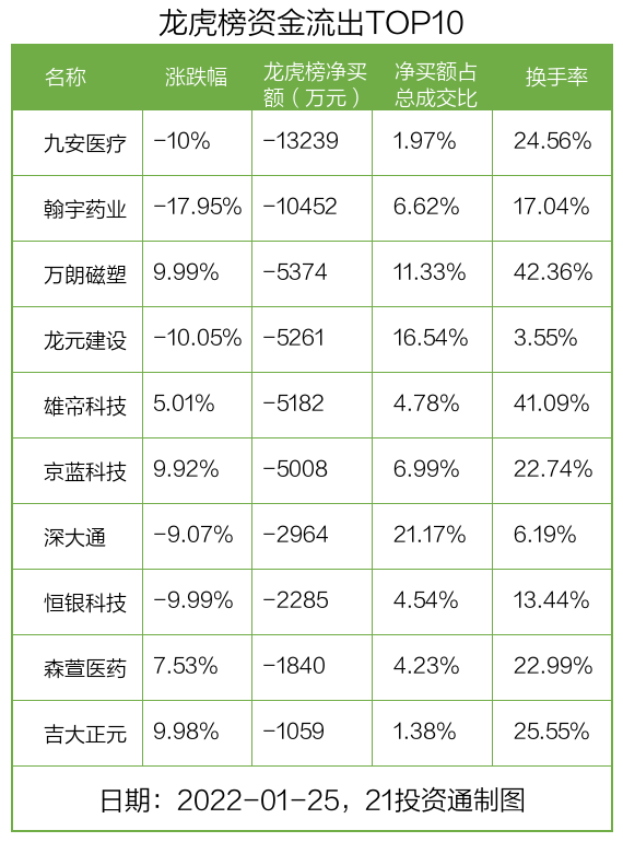 而龙虎榜中资金净流出最多的是九安医疗(002432.SZ),被净卖出为1.32亿元,占总成交金额的1.97%。九安医疗收盘下跌10%,换手率为24.56%。