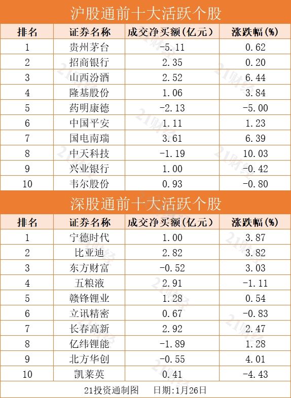 十大活跃个股方面,国电南瑞、五粮液、长春高新分别获净买入3.61亿元、2.91亿元、2.92亿元。贵州茅台净卖出额居首,金额为5.11亿元。