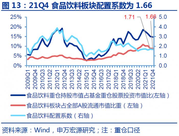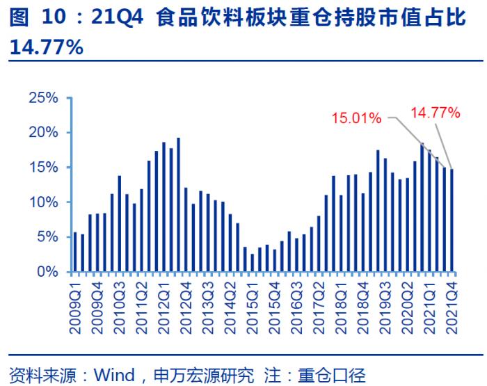 板块配置环比略降,但仍处于历史高位。从2021 年四季度持仓情况看,食品饮料板块重仓股持股市值占基金股票投资市值比(重仓口径)为14.77%,环比下降0.24%,占比依旧处于自2009三季度以来的较高位。