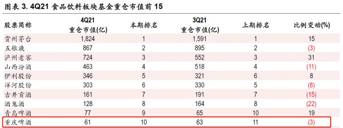 重仓个股看,2021 年第四季度,基金配置的前二十大重仓股中食品饮料板块个股有五家,分别是贵州茅台、五粮液、泸州老窖、山西汾酒和伊利股份,持股市值占基金股票投资市值比分别为2.57%、1.21%、1.01%、0.65%和0.47%。环比三季度,重庆啤酒新进入前10名。