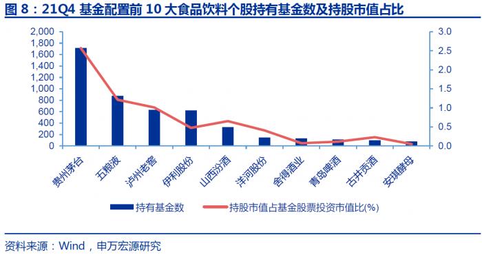 个股持有基金数看,2021年第四季度基金配置前10 大食品饮料个股看,舍得酒业重回前10 大个股,而酒鬼酒、百润股份、华润啤酒跌出前十大。贵州茅台、五粮液、泸州老窖、伊利股份分别持有基金数为1716只、87只、631只、625只,环比变动+189只、-44只、+254只、+193只。