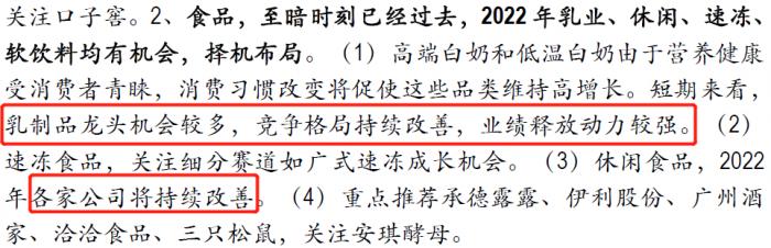 食品,至暗时刻已经过去,2022年乳业、休闲、速冻、软饮料均有机会,择机布局。