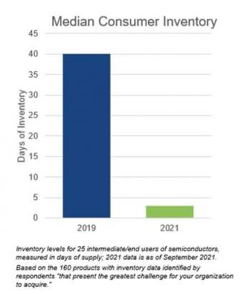 (2019年和2021年的芯片库存中位数表现,统计截至2021年9月,来源:美国商务部)