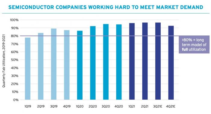 其公布的细节中还提到,自2020年第二季度至2021年,半导体晶圆厂的产能利用率持续高于90%,这是一个难以置信高的程度。