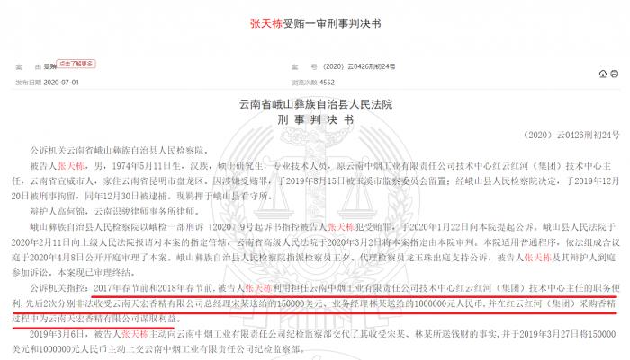 该判决书中明确写到,“2017年春节前和2018年春节前,被告人张天栋利用担任云南中烟技术中心红云红河(集团)技术中心主任的职务便利,先后2次分别非法收受云南天宏香精有限公司总经理宋某送给的15万美元、业务经理林某送给的100万元人民币,并在红云红河(集团)采购香精过程中为云南天宏香精有限公司谋取利益。”