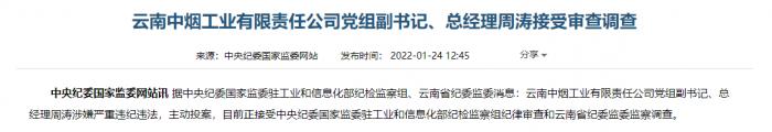 2022年1月24日,云南中烟党组副书记、总经理周涛也被爆出,因“涉嫌严重违纪违法,主动投案,接受审查调查。”