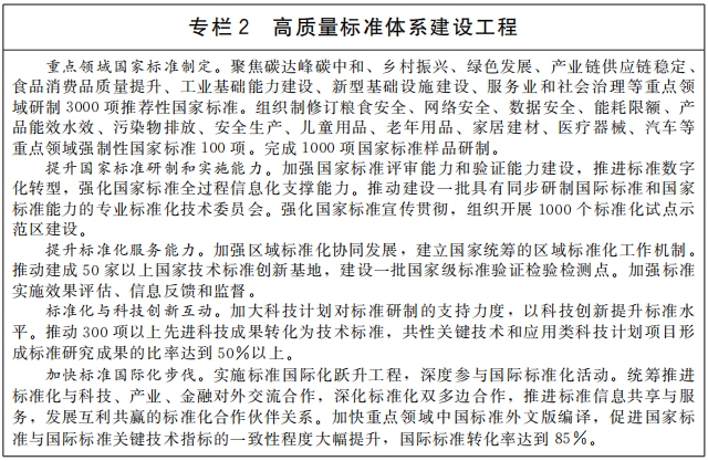 深化标准化改革创新。加快标准供给由政府主导向政府与市场并重转变,标准运用由产业与贸易为主向经济社会全域转变,标准化工作由国内驱动向国内国际相互促进转变,标准化发展由数量规模型向质量效益型转变。持续优化政府颁布标准与市场自主制定标准协调配合的新型标准体系,推动一般性产品、服务标准由市场自主制定,建立健全政府颁布标准采信市场自主制定标准的机制。建立法规引用标准制度,强化法规与标准有效协调机制,运用标准支撑法规落地实施。加强标准化技术组织建设,提升国家标准研制和实施能力。加强国家技术标准创新基地和国家级标准验证检验检测点建设,提升标准化技术支撑水平。实施标准全生命周期闭环管理,完善标准实施信息反馈与评估制度,建立国家标准动态维护机制。开展对标达标专项行动,推动团体标准培优计划和企业标准领跑者制度实施,消除标准制定团体培育发展的政策障碍,释放企业、社会团体标准化活力。