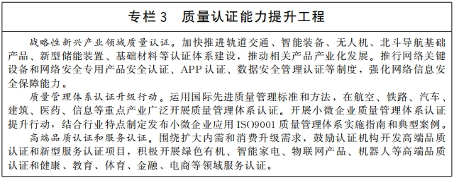 提高质量认证服务能力。加快构建统一管理、共同实施、权威公信、通用互认的质量认证体系,全面提升质量认证服务能力,打造一批具有国际竞争力的认证品牌。推动完善重点产业质量认证制度体系,加大网络安全认证制度推行力度,加快战略性新兴产业领域质量认证制度建设,大力推行高端品质认证和新型服务认证,加快研究和完善国家数据安全标准与认证认可体系。广泛开展质量管理体系认证升级行动。健全政府、行业、社会等多层面的认证采信机制,推动在市场采购、行业管理、行政监管、社会治理等领域广泛采信认证结果。提升认证行业专业化集约化水平,优化行业布局结构,推动认证行业数字化发展。