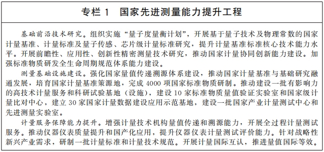 构建现代先进测量体系。加强以量子计量为核心的先进测量体系建设,加快建立新一代国家计量基准,推进社会公用计量标准升级换代,制定一批关系国计民生的重要计量技术规范。改革完善计量器具型式批准、检定、法制监督等管理制度,对强制管理的计量器具目录实施动态调整,完善商品量、计量数据等量值监管制度。深入推进计量技术机构改革创新发展,探索计量校准市场和校准机构建设的有效途径,规范计量校准市场,满足市场对量值溯源和测试服务的需求。建立国家计量数据建设应用示范基地,提升国家产业计量测试和能源计量能力。积极参与国际计量比对,提升国际承认的校准与测量能力。