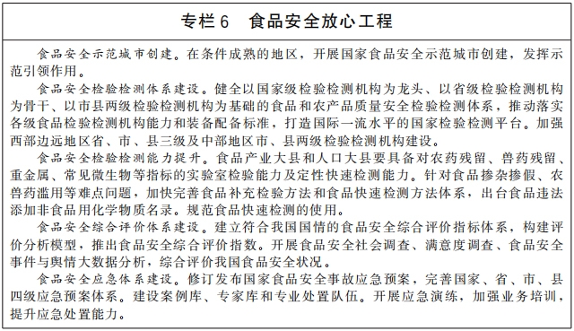 加强食品安全源头治理。加强食品全链条质量安全监管,推进食品安全放心工程建设攻坚行动,加大重点领域食品安全问题联合整治力度。提高粮食收储质量,防止不符合食品安全标准的粮食流入口粮市场和食品生产企业。加快制修订农药残留、兽药残留、重金属、食品污染物、致病性微生物等食品安全通用标准,推进产业发展和监管急需的食品安全基础标准、产品标准、标签标准、配套检验方法标准制修订,完善食品添加剂、食品相关产品等标准。加快食品相关标准样品研制。加强进口食品安全监管,严防输入型食品安全风险。实施农产品原产地追溯促进行动,打造追溯管理规范、市场机制成熟、带动能力强的农产品追溯标杆企业,推动全程追溯协作和示范推广。