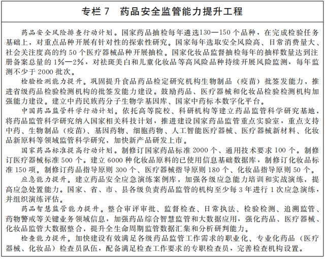 完善药品安全监管制度。加强药物临床试验核查,严格执行药品、医疗器械、化妆品等生产质量管理规范,对重点生产企业开展全覆盖检查。开展药品质量提升行动,健全生物制品等高风险产品标准制定工作机制,提高药品、医疗器械、化妆品标准。改革和完善疫苗监管体制机制,提高省级药品检验检测机构对辖区内生产的主要疫苗品种批签发能力。深入开展无菌植入性医疗器械监督检查、化妆品“线上净网、线下清源”等专项整治行动,切实规范药品、医疗器械、化妆品市场秩序。