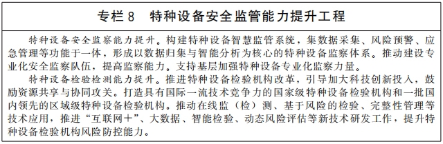 强化特种设备安全风险监控体系建设。优化特种设备监管信息化建设基础和应用环境,推动国家与地方监管数据互联互通,增强数据分析和信用管理功能,完善全国统一的特种设备信息公示查询系统。加强特种设备风险预警与应急处置能力建设,提高安全风险识别和防控能力。推动特种设备使用单位开展风险分级管控,从源头上系统辨识风险、防控风险。完善生产单位、检验检测机构和人员资格信息等特种设备基础数据库。以电梯、气瓶和移动式压力容器、叉车等为重点,建立健全特种设备质量安全管理追溯体系。推动特种设备生产企业加大研发投入,建立科学严密、反应及时的风险防范系统。完善锅炉安全、节能、环保三位一体的监管体系,以实现碳达峰碳中和目标为导向,进一步提升锅炉节能环保水平。