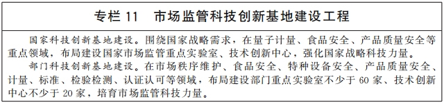 加强科技支撑体系建设。鼓励市场监管领域科研创新,加强市场监管重点领域关键技术攻关和先进装备研制,布局一批国家和部门科技创新基地。重点推进中国标准化研究院国家标准馆建设工程和昌平实验基地二期建设工程、中国计量科学研究院实验基地二期建设工程、国家食品质量安全检(监)测能力建设工程、国家消费品质量安全风险监测预警能力建设工程等建设,全面提升市场监管科技支撑能力。