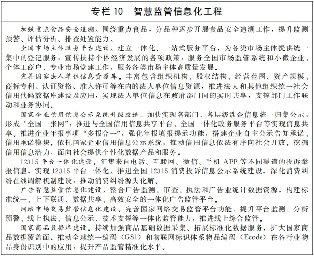 加快推进智慧监管。充分运用互联网、云计算、大数据、人工智能等现代技术手段,加快提升市场监管效能。建立市场监管与服务信息资源目录和标准规范体系,全面整合市场监管领域信息资源和业务数据,深入推进市场监管信息资源共享开放和系统协同应用。