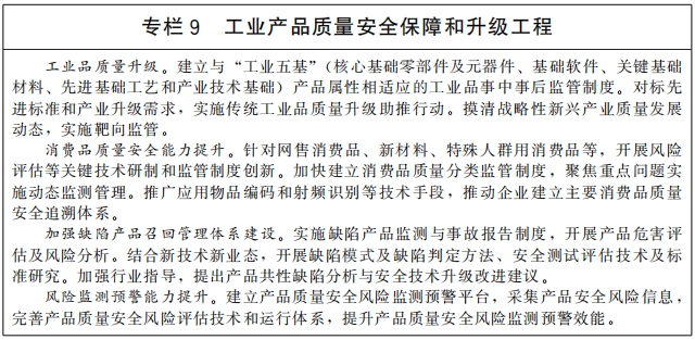 加大消费品安全监管力度。推动企业建立主要消费品质量安全追溯体系,记录重点环节过程信息,实现产品质量安全问题可追溯。健全缺陷产品召回制度,加强大中型客货车、新能源汽车与智能网联汽车、智能家居、儿童用品、电子电器等重点产品召回管理,强化重大案件调查与召回后续监督工作,完善缺陷产品召回技术支撑体系。完善产品伤害监测制度,拓宽监测信息采集渠道,增加监测点,推进产品伤害预防干预。完善产品质量安全事故强制报告和调查处理制度,提高质量安全事故人身伤害赔偿标准。