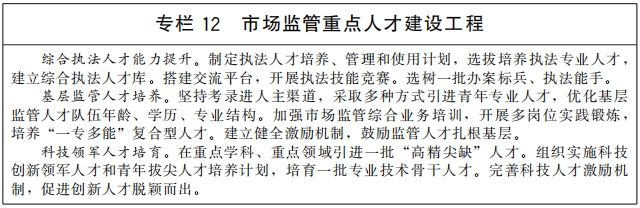 加强人才队伍建设。健全人才引进、培养、使用、评价、激励机制,统筹推进市场监管人才队伍建设。加快高水平市场监管智库和综合型研究机构建设,加强重大理论和实践问题战略研究、决策咨询,开展人才需求分析。推进市场监管人才培养,加快相关学科专业建设,培养符合市场监管现代化需求的后备人才。在检验检测、药品审评、检查核查、网络数据监管、知识产权、质量技术等重点专业领域,着力培养引进一批“高精尖缺”人才。组织开展综合执法大练兵,提升基层人才队伍能力水平。加强市场监管文化建设,增进价值认同、情感认同、文化认同,增强做好市场监管工作的责任感和使命感。