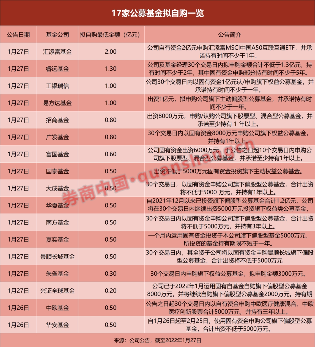 券商中国记者不完全统计显示,截至1月27日,近2日已经有17家公募基金宣布自购,合计自购金额12亿元,其中汇添富基金、睿远基金、工银瑞信、易方达基金四家公司自购金额均在1亿元及以上。