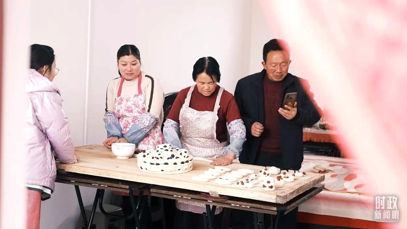 △师红兵(右一)和妻子朱海丹(右二)正在制作年馍。(总台央视记者卢心雨拍摄)