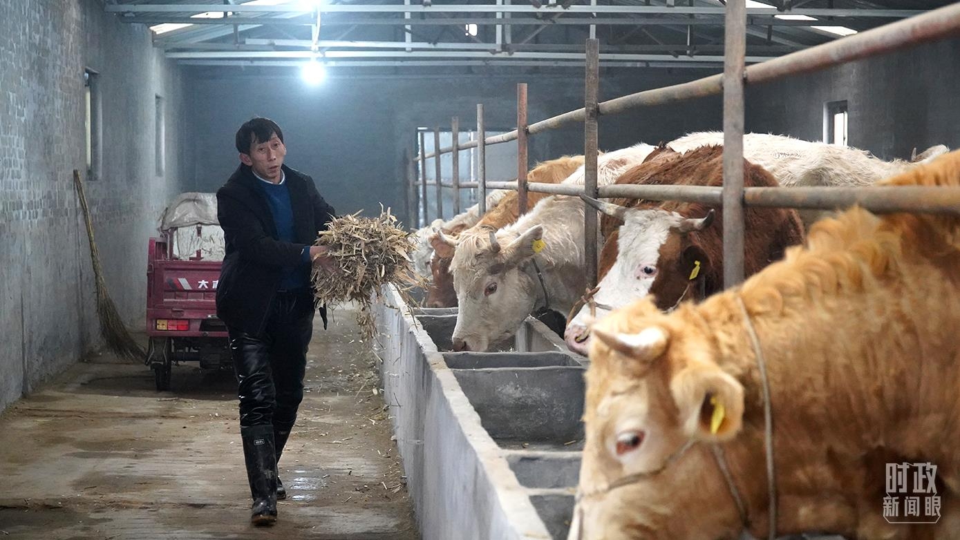 △段村经济合作社养牛基地,工作人员正在添饲料。(总台央广记者潘毅拍摄)