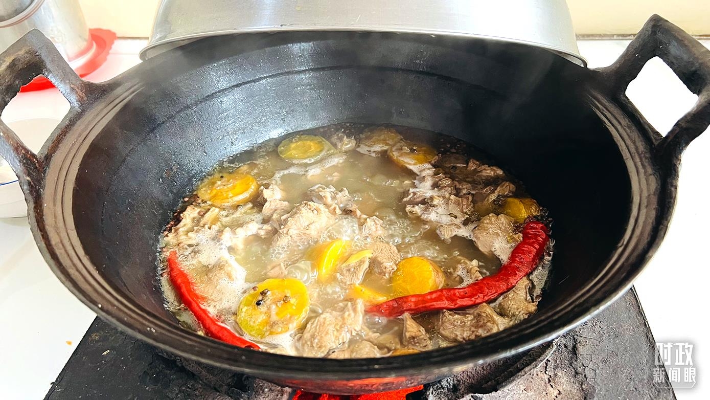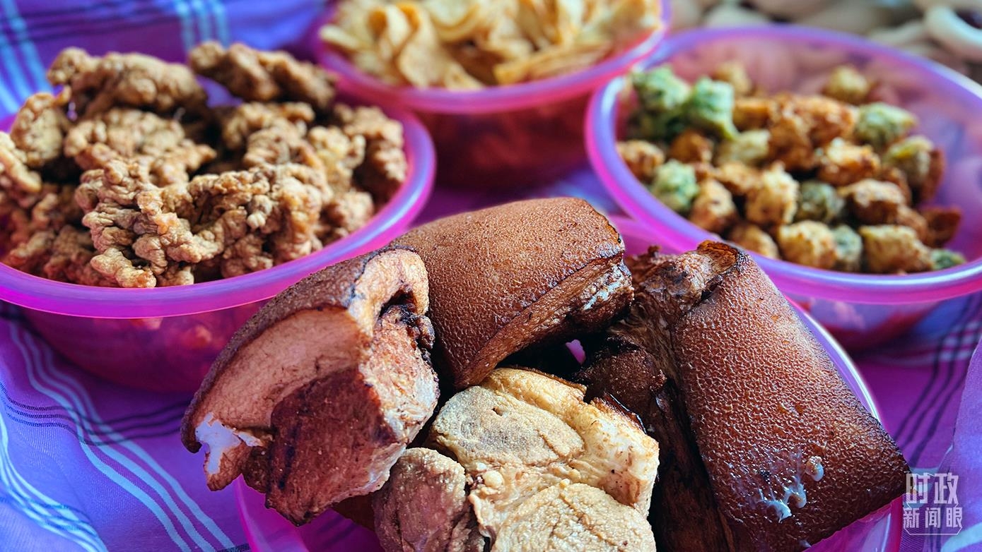 △蔡文明一家制作的炖排骨、年馍、红烧肉、小酥肉等。(总台央视记者钟锋、李辉、杨波拍摄)