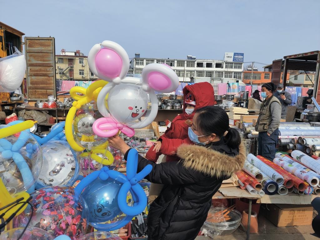 李秀花在年集上给孩子买气球(新华社记者邵鲁文摄)