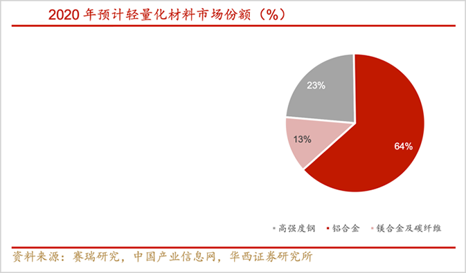 考虑到技术成熟度以及成本优势,铝合金和高强度钢仍然是汽车轻量化的首选。两者合计占据了85%以上的市场,而铝合金占比接近65%。