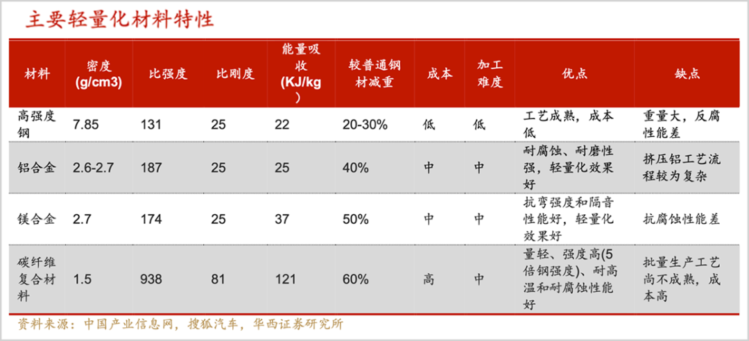 轻量化材料中,镁合金的用量虽不及铝合金,但增量弹性最大。