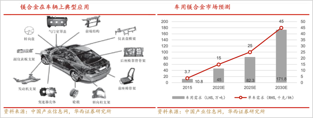 《节能与新能源汽车技术路线图》提出,新能源汽车单车用镁量将从2020年的15kg增长至2030年的45kg,增幅高达2倍,显示出镁合金的增量价值。