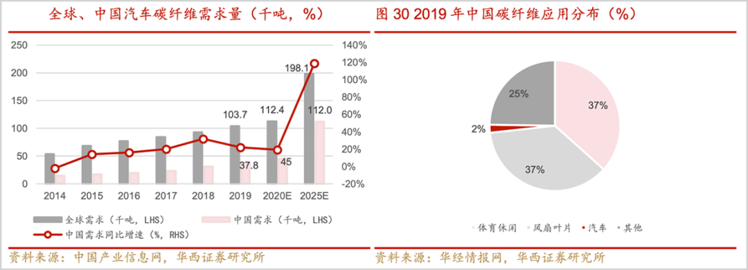 随着成本的降低,碳纤维汽车用量会逐步增加,机构预测2025年全球和中国汽车碳纤维需求量将达到19.81和11.2万吨,汽车碳纤维占比增加至5%,用量将达到5600吨。
