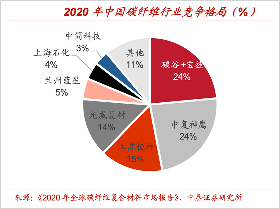 民营企业中的光威复材(300699.SZ)和中简科技(300777.SZ),其产品已经打入航空航天等军工体系,光威复材还是风电巨头维斯塔斯的碳梁主供应商。