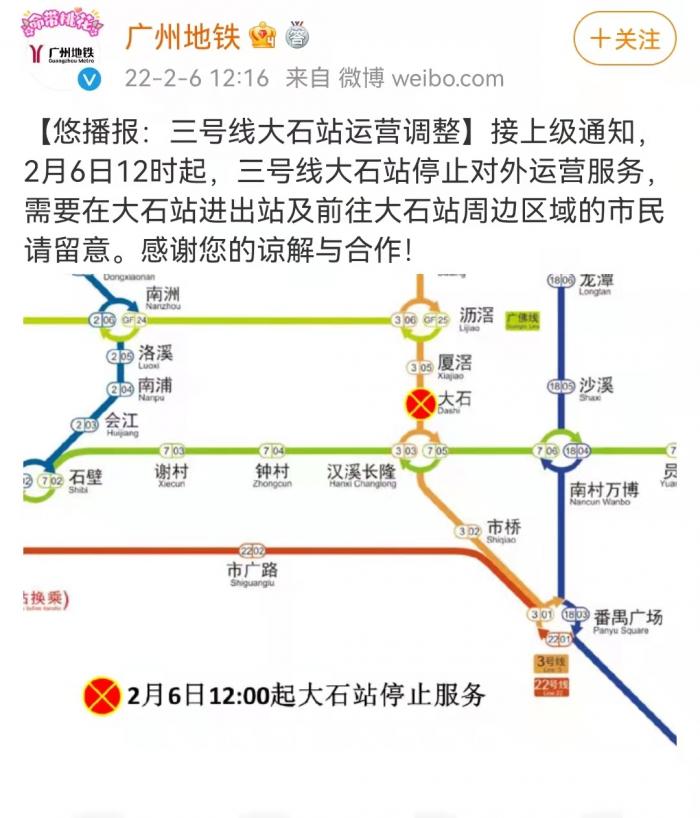 广州地铁发布消息,接上级通知,2月6日12时起,三号线大石站停止对外运营服务,需要在大石站进出站及前往大石站周边区域的市民请留意。