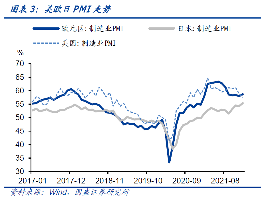 海外经济稳步回落。1月摩根大通全球制造业PMI录得53.2%,较前值回落了1.1个百分点,海外经济总体在放缓。分国家来看,美国经济震荡回落,欧元区经济较为平稳,而日本经济持续回升。1月美国PMI较前值回落了1.2个百分内点至57.6%,已经连续2个月回落。随着财政刺激政策退坡以及货币政策收紧,美国经济边际在回落。欧元区1月制造业PMI较前值上行0.7个百分但录得58.7%,依然处于高位,显示欧元区经济保持平稳。中国进口领先欧元区经济,中国经济短期维持弱势,有待稳增长政策进一步发力,这意味着欧元区经济后续也有下行压力。日本1月PMI回升1.1个百分点至55.4%,处于历史上的高位水平。海外经济放缓,意味着中国外需将会边际走弱。