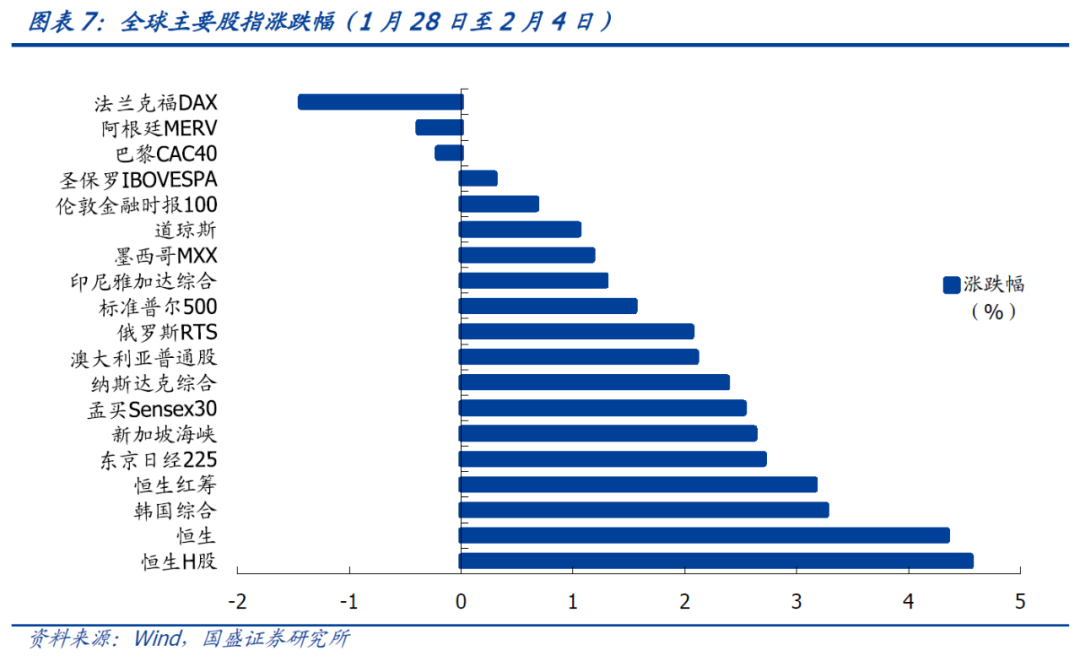 全球股市有所反弹,恒指大涨,人民币汇率基本稳定。春节期间全球股市总体止跌反弹,主要是因为股市已经提前反应了主要央行货币政策收紧的预期。在没有进一步收紧信息的情况下,股市逐渐消化货币收紧预期并带动股市出现短期反弹。其中恒生指数涨幅最为明显,春节期间大涨4.6%,对节后A股走势形成利好。而人民币汇率基本稳定,由于美元有所贬值,因而人民币兑美元离岸汇率小幅从6.37升值至6.36。