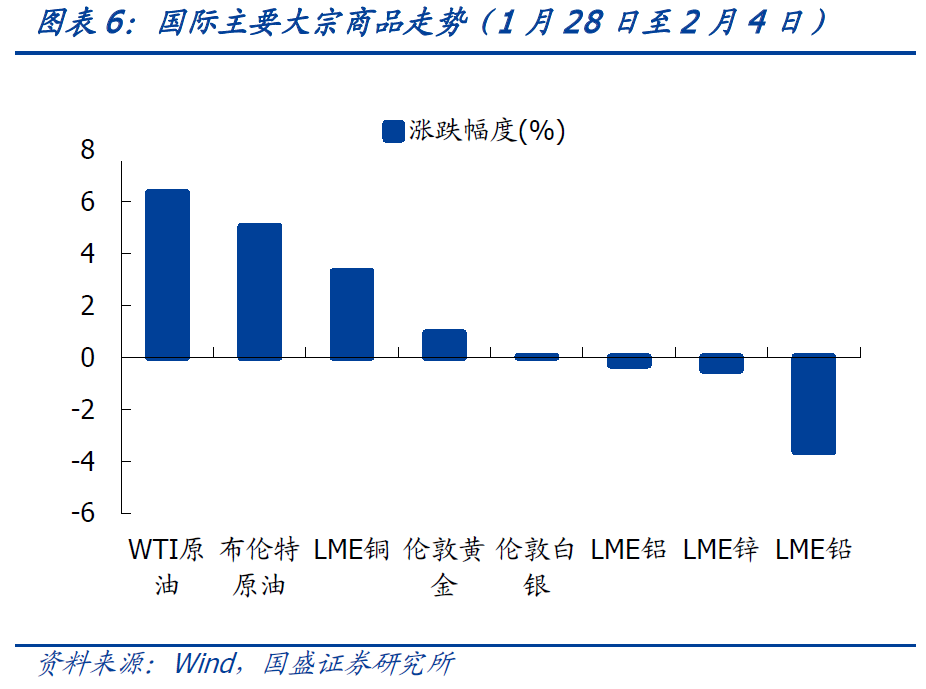 美国寒冷天气影响原油供给并提升原油需求,因而带动油价快速上行。从大宗商品价格表现来看,春节假期中WTI原油价格涨幅最快,上行了4%,截止2月4日美油期货价格上行至了92.3美元/桶。美国寒冷天气将导致对能源需求提升和供应受阻这提升了原油价格。2月2日,OPEC+召开月度产油政策会议,表示维持原定计划在3月增产40万桶/日,增产也并未超预期。铜价在春节期间也表现较好,上涨了3.3%。由于美元指数的回落,这提振了黄金价格,春节期间黄金价格小幅上行了0.9%。