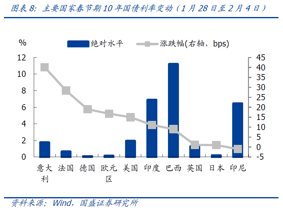 主要央行收紧货币政策并带动国债利率总体上行。春节期间主要发达国家国债利率震荡回升,以联储为代表的主要发达国家央行收紧货币政策是带动国债利率上行的主要原因。截止2月4日,10年美债利率录得1.93%,较28日快速上行了15bp,创疫情后新高。由于英国央行再度加息和欧央行转鹰,这带动德国、意大利、法国和英国国债利率春节期间分别上行了19bp、40.1bp、28.4bp和1.1bp。当前中美10年国债利差为76bp,低于80-100bp的正常区间水平,外资购买中国债券增量可能放缓,但是外资并非国内债市的主导,短期美债利率上行对国内债市影响可控。