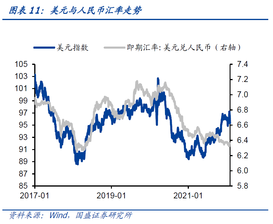 美元贬值,主流货币对美元升值。截止2月3日,美元指数收于95.3%,上周下跌了1.9%。美元指数阶段性走弱,或与欧元边际走强有关。在欧央行转鹰,以及美国1月PMI回落而欧元区PMI回升的影响下,欧元相对美元指数走强并带动美元指数走弱。另外,市场对联储加息和缩表预期有所消化,也导致美元指数回调。离岸人民币汇率在美元走弱下小幅升值了0.3%。由于22年出口增速将会在海外续期下行的带动下走弱,叠加中国货币政策维持宽松,因而22年人民币汇率或有贬值压力。
