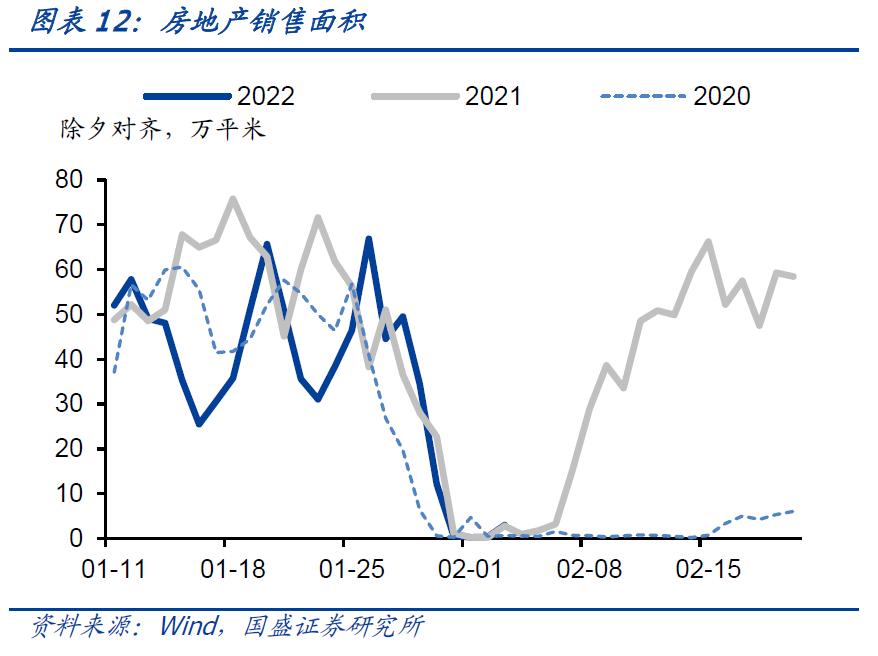 以除夕对齐,除夕前一周地产销售面积跌幅有明显收窄,持续性有待观察。除夕前一周房地产销售面积均值增速同比下跌-1%,较前值-33%的跌幅有明显收窄。在按揭额度放松和按揭利率下行的推动下,房地产销售面积有所改善,但是持续性还有待观察。